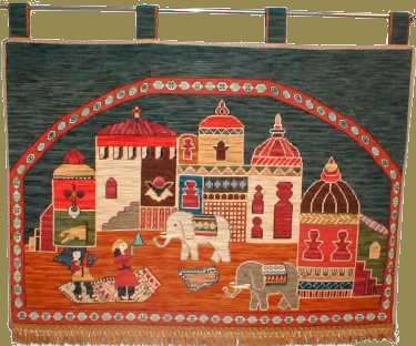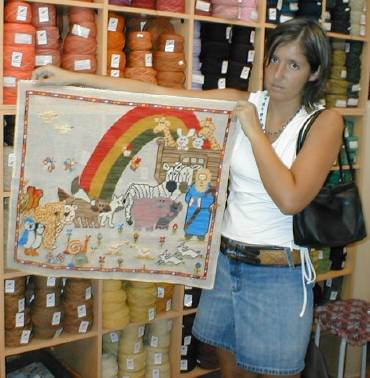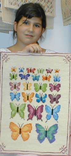 Claudia Araos bordó para sus niños estos originales tapices, de Mariposas que aquí nos muestra su hija Constanza y debajo de los elefantes vemos La Granja, ambas en esterilla delgada. | |||||||||||