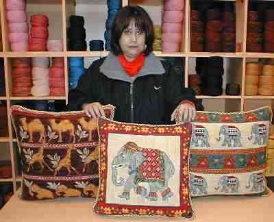 muestra estos tres cojines de camellos, jirafas, elefantes y más
