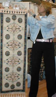 Carolina Ramírez bordó en esterilla delgada este Camino de Mesa de 40 x 120 cm. con pasamanería de fleco español en las puntas. |