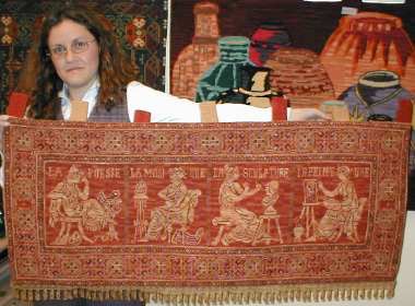 | Paola Murúa nos muestra su versión de el mural Las Artes en esterilla delgada de 47 x 111 cm. Escogió abarzaderas de sedas en colores 5 y 6 alternados y flecos de seda en el extremo inferior dentro de la gama de colores. | |||||||||||||