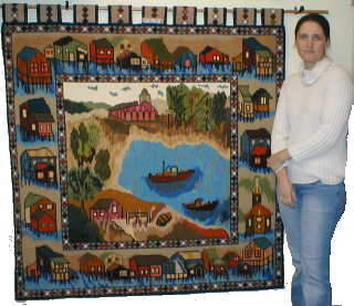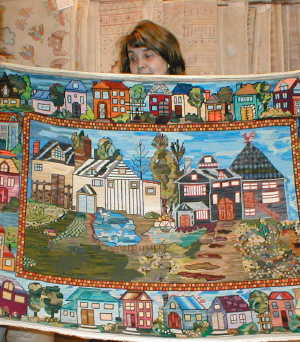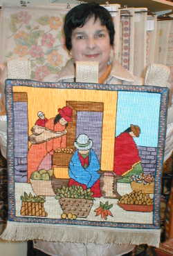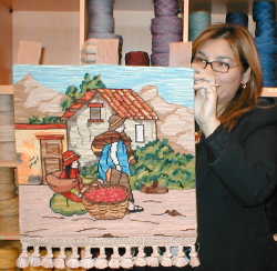 esterilla gruesa bordado por Sonia Stigel. Lo muestra su amiga Anne Marie quien se lo llevará a Valdivia. |