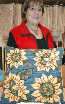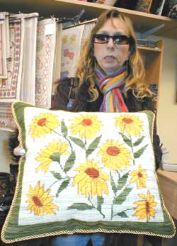 A la derecha, Leonor González nos muestra este gran cojín de diseño Kilin de 55 x 55 cm. en esterilla delgada bordado por ella misma. |