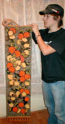 Camino de mesa Frutal Naranjas y Limones de 30 x 115 cm. bordado en esterilla delgada por Lily Tobar. Lo muestra su hijo Gabriel. |