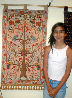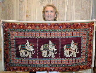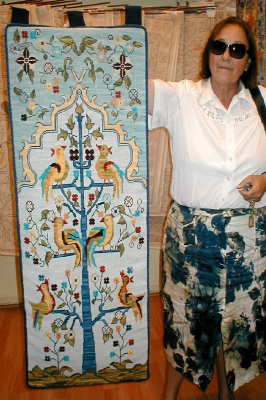 | Mural Medieval de 90 x 130 cm. en esterilla delgada, bordado por Elizabeth Cosmelli. Eligió el fondo negro para lograr un mejor resalte de las figuras. Muy buena decisión. | Piecera bordada en esterilla gruesa de 70 x 180 cm. Luz Lizama diseñó ella misma este trabajo. | ||||||||||||||||||||||||||||