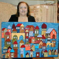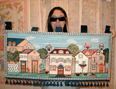 A la izquierda, apaisado mural Casitas de 90 x 40 cm. bordado en esterilla delgada por Mabel Ortega. | ![]() |