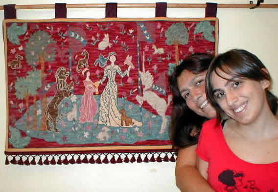 Unicornio en esterilla delgada de 90 x 60 cm. Bordado por María Elisa Nalegach, en la foto junto a su hija Catalina. |