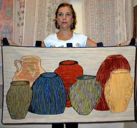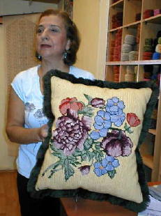 Mural de Jarrones en esterilla gruesa de 115 x 70 cm. Bordado por Silvia Nahum, quien nos muestra también este cojín Floral en esterilla delgada de 40 x 45 cm. | ||||||||||||||||||||