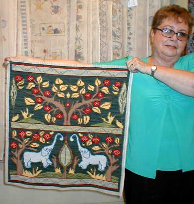 Pequeño mural (también puede terminarse como gran cojín) Elefantes y Arbol de 60 x 60 cm. en esterilla delgada bordado por Elsa Latrille. | ||||||||||||||||||||