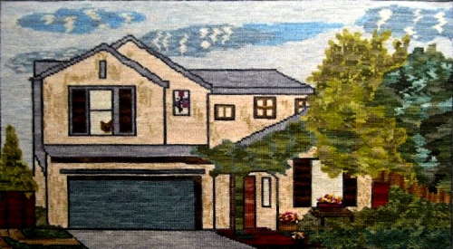 | Desde California nos llega este original bordado realizado por Carmen Tetelboin en que aparece su casa allá. Arriba está la fotografía con que trabajamos para tizar la esterilla. Mide 50 x 80 cm. | |||||||||||||||||||||
