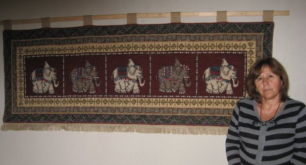 | Patricia Segovia bordó este e-nor-me Mural de Elefantes que tiene 200 x 70 cm. en esterilla delgada. La terminación se hizo con abrazaderas y flecos de yute. | ||||||||||||||||||||||