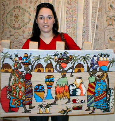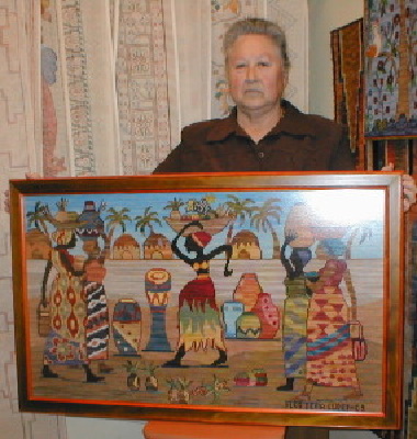 | Arriba, Africanas de 55 x 90 cm. en esterilla delgada bordadas por Olga Devia lo terminó como cuadro con marco de madera y vidrio opaco (que nosotras no hacemos...). | Una versión del mural Africanas de 90 x 50 cm. en esterilla delgada, realizada por Pamela Pérez. | |||||||||||||||||||||
