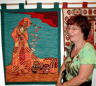 A la derecha Patricia Fuenzalida nos muestra su mural Late Harvest en esterilla gruesa de 120 x 35 cm.