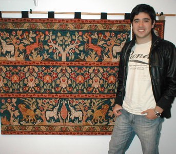 Elegante tapiz Elefantes y Leones de 130 x 110 cm. Bordado por Coloma Muñoz y lo muestra su hijo Nicolás Saez.![]()