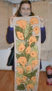 Precioso camino de mesa Calas en esterilla delgada de 100 x 40 cm. bordado por Caroline Stewer.![]()