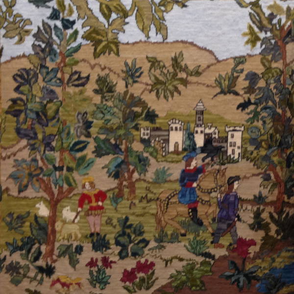 Mural La Caza en esterilla delgada de 100 x 130 cm. bordado por Alicia Meza.