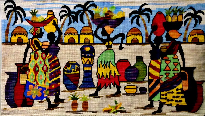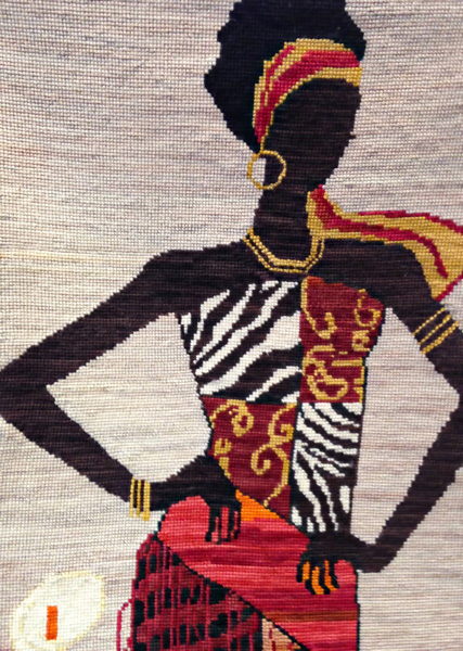 Eugenia Vent con el tapiz Las Africanas de 60 x 100 cm, en esterilla delgada con terminación de Yute en abrazaderas y flecos.![]()