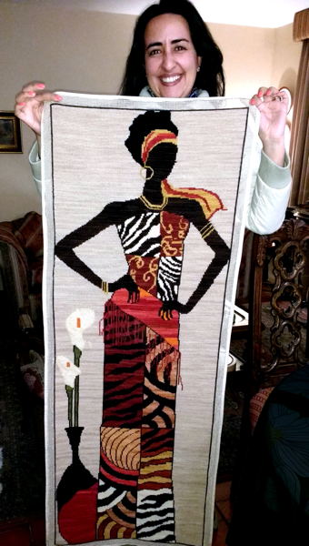Mónica Valenzuela bordó este tapiz Amira de 50 x 120 cm. en esterilla delgada para su nuera Romy Vera, quien aparece aquí abajo mostrándolo feliz.