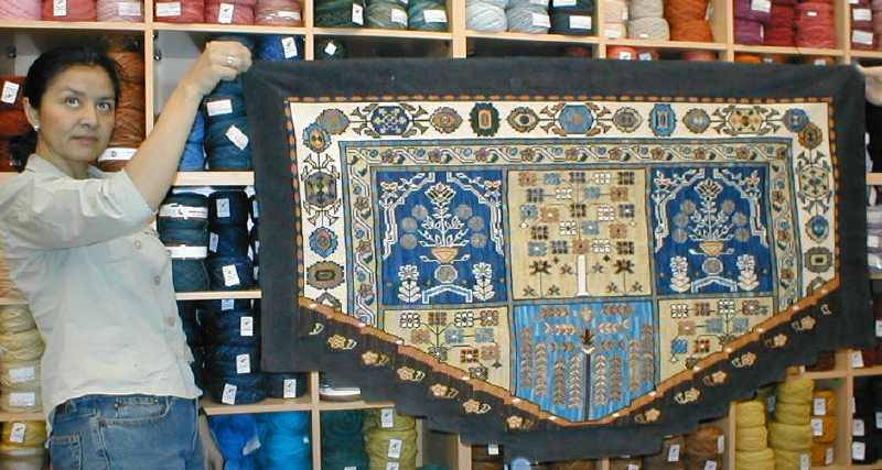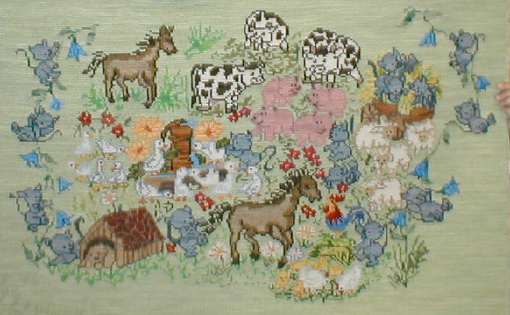 Claudia Araos bordó para sus niños estos originales tapices, de Mariposas que aquí nos muestra su hija Constanza y debajo de los elefantes vemos La Granja, ambas en esterilla delgada. | |||||||||||