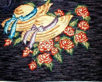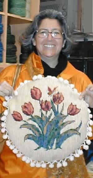 | Cojín de Tulipanes en formato redondo de 42 cm. en esterilla delgada bordado por Rebeca Giorgio. | ||||||||||||||||