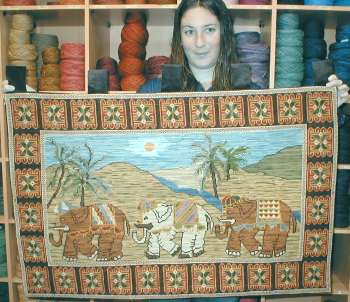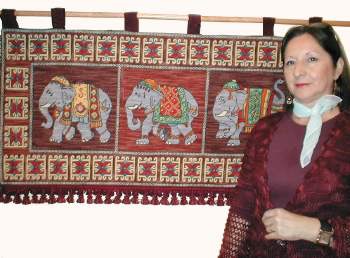 | Mural Oasis con Elefantes en esterilla delgada de 95 x 62 cm. bordado por Lorena Casanueva. | |||||||||||||