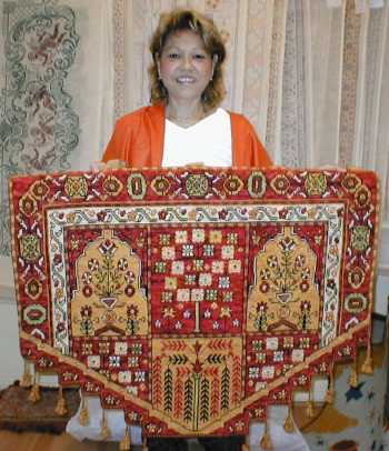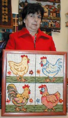 Mural Faisanes en esterilla delgada de 125 x 93 cm. diseñado y bordado por Silvia Rodríguez, quien por supuesto es también quien nos lo muestra. |