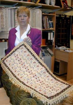 Carolina Ramírez bordó en esterilla delgada este Camino de Mesa de 40 x 120 cm. con pasamanería de fleco español en las puntas. |