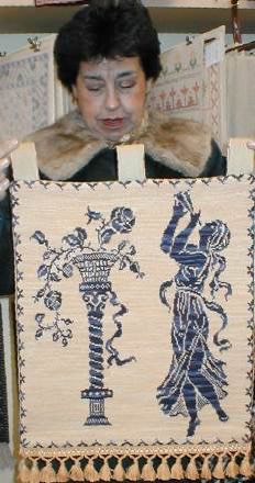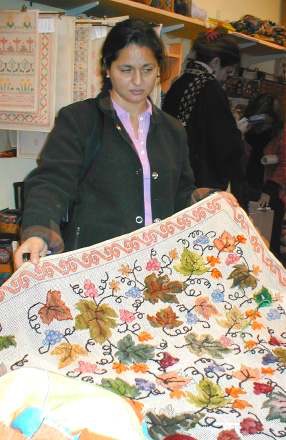 de seda y pompones en sus extremos. Bordado por María Teresa Rubio. Lo muestra Paulina Valencia. |