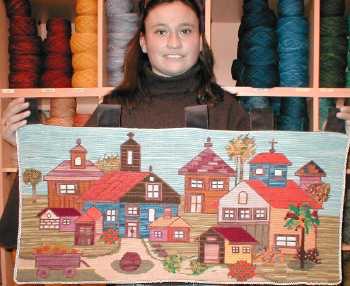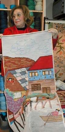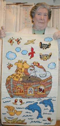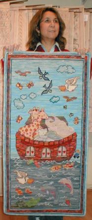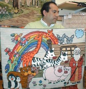 | Alfombra Arca de Noé de 110 x 60 cm. bordada por María Eugenia Casares. La muestra María Teresa Luengo. | Otra Arca de Noé de 98 x 55 cm. en esterilla delgada bordada por María Elena Ovalle. | ![]() |