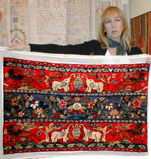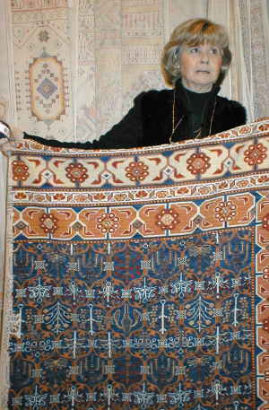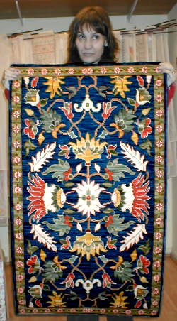 | Aquí vemos a Yvette de la Harpe ya terminando su enorme alfombra de 250 x 300 cm. en esterilla delgada. Podemos ver el comienzo en nuestra página 3. | ||||||||||||||||||||