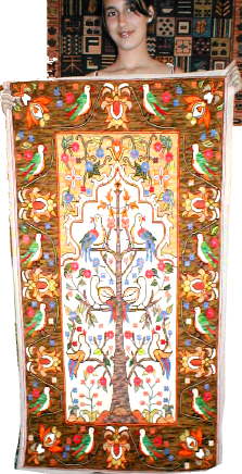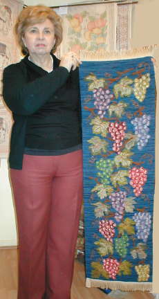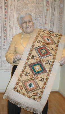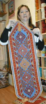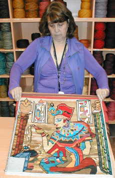 esterilla gruesa bordado por Sonia Stigel. Lo muestra su amiga Anne Marie quien se lo llevará a Valdivia. |