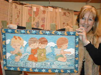| A la izquierda, mural Angel de la Guarda de 65 x 37 cm. en esterilla delgada bordado por María Luisa Ovalle. | ||||||||||||||||||||