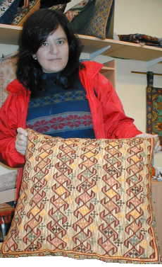 A la derecha, Leonor González nos muestra este gran cojín de diseño Kilin de 55 x 55 cm. en esterilla delgada bordado por ella misma. |