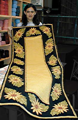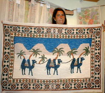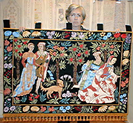 | Mural Medieval de 90 x 130 cm. en esterilla delgada, bordado por Elizabeth Cosmelli. Eligió el fondo negro para lograr un mejor resalte de las figuras. Muy buena decisión. | Piecera bordada en esterilla gruesa de 70 x 180 cm. Luz Lizama diseñó ella misma este trabajo. | ||||||||||||||||||||||||||||
