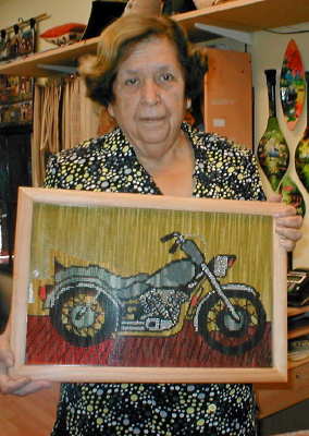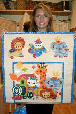 | Super Moto! de 40 x 30 cm. bordada por Margarita Acuña en esterilla delgada para su nieto terminada como cuadro, vidrio incluido. | Largo Camino de Uvas en esterilla delgada de 115 x 20 cm. bordado por Mariana de Grote. | Ana María Schultz nos vuelve a sorprender ahora con esta alfombra Patchwork en esterilla gruesa de 110 x 155 cm. | |||||||||||||||||||||||||||