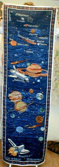 | Del Cielo al Suelo Muy novedosa alfombra de 70 x 210 cm. en esterilla delgada bordado por Monica Peñailillo sobre un diseño de Marjorie Gray. |