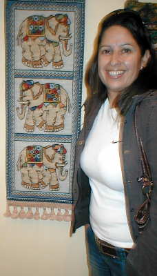 A la izquierda, apaisado mural Casitas de 90 x 40 cm. bordado en esterilla delgada por Mabel Ortega. | ![]() |