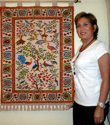 Mural de Jarrones en esterilla gruesa de 115 x 70 cm. Bordado por Silvia Nahum, quien nos muestra también este cojín Floral en esterilla delgada de 40 x 45 cm. | ||||||||||||||||||||