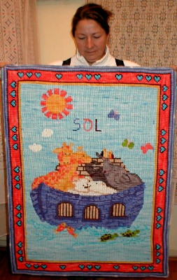 A la izquierda, alfombra Arca de Noé de 60 x 90 cm. en esterilla gruesa bordada por Yolanda León. | ![]() |