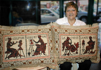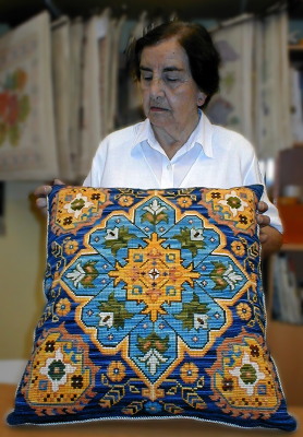 | Arriba, Ana María Kochifas bordó estos cojines de Las Artes en esterilla gruesa de 50 x 70 cm. cada uno, | A la derecha, Marta Rojas bordó este cojín Oriental 2 en atractivos y distintivos colores. Esterilla delgada de 50 x 50 cm. | |||||||||||||||||||||
