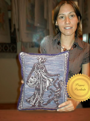 | A la derecha, cojín de 35 x 30 cm. La Dama y el Niño en esterilla delgada. Pordado por Pamela Soto, su primer trabajo. Felicitaciones! |