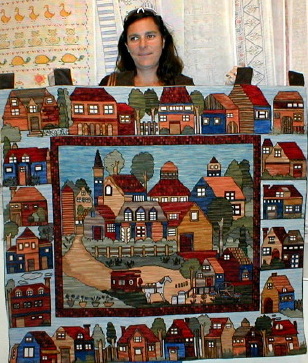 | Gran Mural de Casitas, bordado en esterilla delgada de 120 x 110 cm. El colorido y las terminaciones fueron escogidas por María Isabel Saavedra, quien lo bordó y lo muestra. | ||||||||||||||||||||||