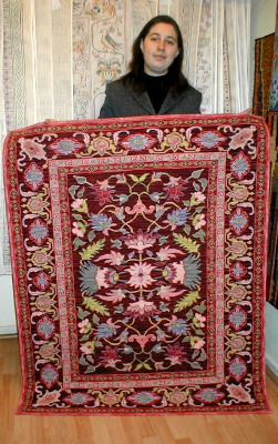| Alfombra Mahal de 140 x 115 cm. en esterilla delgada, en tonos burdeos, rosa y verdes, muy bien escogidos por Fernanda Juppet, quien la bordó. Ver la del catálogo en Alfombras 7. | Alfombra de 100 x 220 en