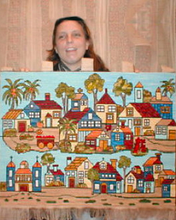 Mural Casitas de 75 x 55 cm. en esterilla delgada bordado por Verónica García.