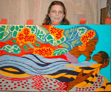 Mural Kenya de 60 x 80 cm. bordada en esterilla delgada por Paulina Silva.