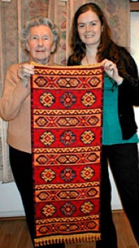 Enorme alfombra Bowanat (pueden verla también en la página 6 de alfombras) en esterilla gruesa de 136 x 200 cm., de la que vemos sólo la mitad (está doblada en dos) bordada por Paola Aedo.![]()