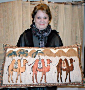 Gran cojín de Camellos, realizado a partir de un mural de 80 x 45 cm. en esterilla delgada bordado por Lucía Prat.![]()
